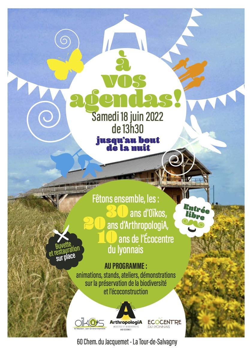 30 ans pour Oïkos, 20 ans pour Arthropologia, 10 ans pour l'Ecocentre du Lyonnais : un triple anniversaire que les deux associations fêteront le samedi 18 juin, de 13h30 jusqu'au bout de la nuit dans les jardins de l'Ecocentre. 🎉
